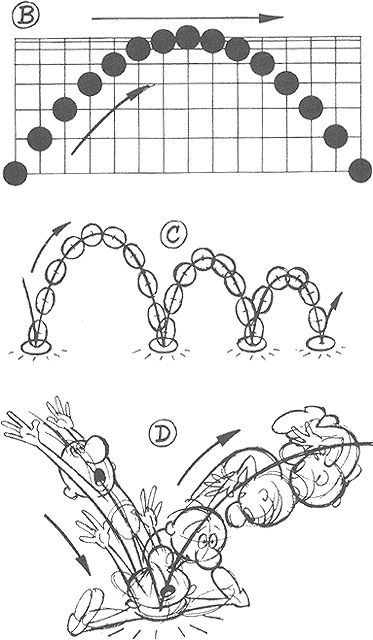 Вы бросаете предмет вверх по вертикали. Скорость его взлета постепенно убывает, доходит до нуля (рис. А ). Дальше предмет начинает падать, скорость возрастает — по тем же делениям, что и при взлете, но в обратном порядке. Если бросить предмет не вертикально, а под углом, его полет получит два направления: вертикальное и горизонтальное. Скорость подъема, как и в прошлом примере, постепенно угаснет, после чего наступит ускоряющееся движение вниз, а горизонтальное движение останется почти без изменений. Предмет пролетит по траектории, показанной на рис. В. Резиновый мяч, упавший на твердую поверхность, может совершить серию прыжков в виде траекторий на рис. С; при каждом следующем ударе энергия мяча убывает, следовательно, уменьшается и траектория полета. На этом же рисунке показано расположение фаз движения мяча. Фаза, идущая сразу после удара, должна частично перекрывать предыдущую; следующая фаза помещается уже с отрывом, учитывая полученную при отскоке скорость; ближе к зениту траектории фазы будут располагаться все плотнее, поскольку скорость уменьшается; дальше, с падением мяча, скорость вновь нарастает и расстояние между фазами увеличивается. При очень большой скорости, когда дистанция между фазами превышает диаметр самого мяча, рекомендуется вытягивать мяч по оси движения и добавлять сзади спидлайны (см.о них на стр. 110).Это поможет глазу соединить разрозненные фазы в цельное движение. А) Скорость мяча, взлетающего по вертикали, уменьшается и полностью гаснет под действием гравитации. Эта же шкала может быть использована для падения мяча.