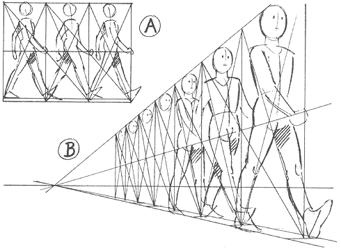Движение в глубину и из глубины требует от аниматора владения рисунком и некоторых познаний в области геометрии. Для такого движения вычерчивается точная перспективная шкала, показывающая величину фигуры, размах шага в разных точках пространства и с определенного угла зрения. Шкала помогает сохранить правильные пропорции персонажа. В «тотальной анимации», где вместе с персонажем фазуется фон и смещается горизонт, происходит изменение проекции самой фигуры.