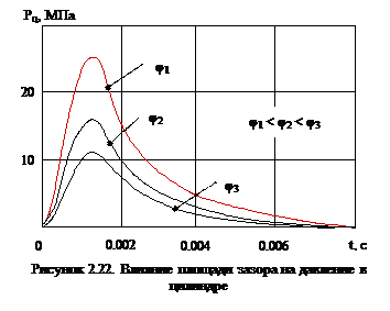 Влияние начального объема цилиндра показано на рисунке 2.20. С увеличением начального объема максимальное значение силы давления существенно снижается, а ее полный импульс за счет растягивания процесса во времени уменьшается весьма слабо. Следовательно, увеличением начального объема можно снизить максимальные нагрузки, передаваемые через поршень и другие части оружия, и сделать их более легкими. Вместе с тем возможности регулировки полного импульса давления пороховых газов на поршень с помощью начального объема весьма ограничены. Пределы регулирования существенно расширяются лишь тогда, когда в двигателе используется часть импульса силы давления за счет какого-либо конструктивного ограничения времени действия газов на поршень. Таким образом, начальный объем, оказывая существенное влияние на вид кривой, практически не оказывает влияние на величину полного импульса давления. Увеличение начального объема способствует повышению плавности работы механизмов оружия, однако при этом увеличивается вес и габариты артиллерийского оружия. Влияние площади поперечного сечения газоотводного отверстия на работу газа двигателя автоматики оружия показано на рисунке 2.21. Изменением сечения газоотводного отверстия автоматики оружия можно в широких пределах регулировать максимальное значение силы давления пороховых газов на поршень и ее полный импульс, что довольно широко используется на практике.