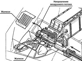 В процессе стрельбы при экстракции гильз значительная часть пороховых газов выходит из патронника и, смешиваясь с воздухом, заполняет отсеки артиллерийской установки, на которой закреплено оружие. Если концентрация пороховых газов достигает 10…20% от общей массы воздуха в отсеках установки, то эта порохо-воздушная смесь уже становится взрывоопасной. Взрыв может произойти с поступлением очередной порции пороховых газов, которые имеют температуру порядка 1000…1500 °С. Последствия взрыва могут быть очень тяжелыми, вплоть до катастрофы летательного аппарата. К настоящему времени установлено, что минимальная взрывоопасная концентрация пороховых газов в отсеках артиллерийской установки не должна превышать 8%. Для обеспечения этого условия с помощью жалюзей (рисунок 4.4) или специальных диффузоров организуется вентиляция или продувка отсеков артиллерийской установки набегающим воздушным потоком. Другой способ обеспечения взрывобезопасности – нагнетание с началом стрельбы в отсеки артиллерийской установки инертного газа (СО2), с которым пороховые газы не образуют взрывоопасной смеси.
