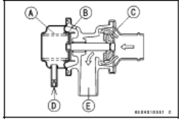 NOTE Clean Air System ENGINE TOP END Vacuum Switch Valve Test Using the vacuum gauge and a syringe, inspect the vacuum switch operation as follows. • Remove a vacuum switch valve. • Connect a vacuum gauge [A] and syringe [B] or fork oil level gauge to the vacuum hoses as shown. Air Flow [C] Special Tool - Fork Oil Level Gauge: 57001-1290 • Gradually raise the vacuum (lower the pressure) applied Spring [A] Diaphragm [B] Valve [C] Low Vacuum [D] Secondary Air Flow [E] • If the vacuum switch valve does not operate as described, О To check air flow through the vacuum switch valve, just blow through the air cleaner hose. Vacuum Switch Valve Closing Pressure (open —> close) High Vacuum [A] Secondary air cannot flow [B].