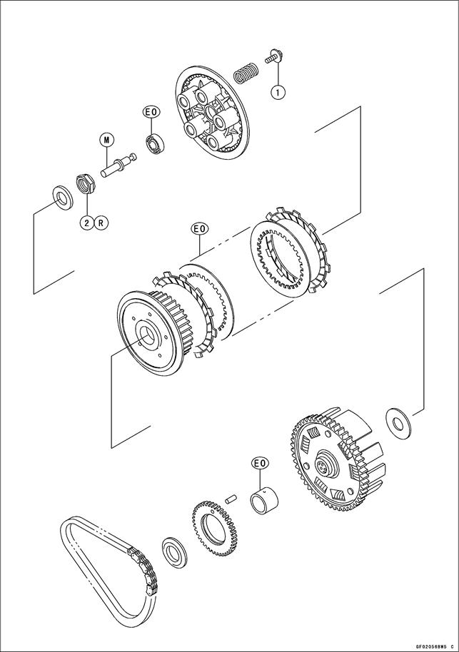 EO: Apply engine oil. M: Apply molybdenum disulfide grease. R: Replacement Parts
