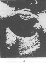 следует с осторожностью относиться даже к четким эхо-графическим данным о наличии отслойки сетчатки, т.к. эхосигнал, имитирующий «отслоечный», может быть получен и при наличии шварт, мембран при пролиферирующей ретинопатии. Более наглядные данные можно получить, используя двухмерную эхографию (Б—эхография или сканирующая эхография) (рис.38). Двухмерная эхография позволяет определить контуры отслоенной сетчатки, что представляется особенно ценным при подозрении на воронкообразную отслойку у пациентов с непрозрачными оптическими средами. При получении картины типичного «треугольника» (см.рис.386) диагноз воронкообразной отслойки становится более вероятным. В клинической практике целесообразно использовать ультразвук частотой 10—15 мегагерц при обследовании глазных оболочек и 5 мегагерц для исследования орбиты. Электрофизиологические обследования играют второстепенную роль, однако могут быть полезны при оценке жизнеспособности сетчатки при старых тяжелых формах отслойки сетчатки. Отсутствие ЭРГ, повышение порогов электрической чувствительности и снижение электролабильности (порог электрической чувствительности выше 300 мкА) служит плохим прогностическим признаком (35,48,49,89). В некоторых случаях особую ценность приобретает комбинация двух методов — ультразвуковой эхографии (А и Б методы) и регистрации электроретинограммы. При получении на эхограмме данных за воронкообразную отслойку, отсутствие ЭРГ говорит в пользу отслоения сетчатки, а наличие ЭРГ свидетельствует о псевдоотслойке, которую симулируют пролиферирующие мембраны или утолщенная задняя гиалоидная мембрана стекловидного тела. При наличии оборудования регистрации вызванных потенциалов коры (ВПК) может быть полезным прогнозированием потенциальной остроты зрения на глазах с непрозрачными оптическими средами. При наличии ЭРГ и ВПК (нормальных показателей) можно предположить достаточную сохранность сетчатки и возможность получения высокого зрения в послеоперационном периоде. Наличие нормальной ЭРГ и отсутствие ВПК заставляет предполагать нарушение проводимости в зрительных путях с сохранностью сетчатки. Возможности применения флюоресцентной ангиографии довольно ограничены в предоперационном обследовании больных с отслойками, однако она может быть использована для подтверждения и оценки тяжести макулярного отека. Кроме того, флюоресцентная ангиография радужки может выявить субклинические нарушения васкуляризации радужки при диабетической ретинопатии и следить за динамикой ее развития (94,106). Весьма полезно в предоперационном обследовании использовать некоторые энтоптические феномены, которые просты по методике, безопасны, не требуют специальной аппаратуры (54,56). В первую очередь — это феномен механофосфена. Ощущение светового пятна — механофосфена — возникает при надавливании на склеру в месте проекции сетчатки. Светлое или темное пятно при этом проецируется в пространство со стороны противоположной давлению. Это свидетельствует о функциональной сохранности периферии сетчатки в месте вдавливания. Возникновение феномена не зависит от прозрачности оптических сред, что особенно важно при сочетании отслойки с катарактой, помутнением роговицы, гемофтальмом. Исследование проводится в слегка затемненной комнате с помощью обычн
