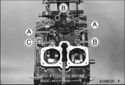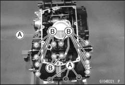 Crankcase Splitting • Remove the engine (see Engine Removal in the Engine Removal/Installation chapter). • Set the engine on a clean surface and hold the engine steady while parts are being removed. • Remove: Shift Pedal Link Lever Starter Motor (see Starter Motor Removal in the Electrical System chapter) Water Pump (see Water Pump Removal in the Cooling System chapter) Clutch Cover (see Clutch Cover Removal in the Clutch chapter) • Remove the following parts only if the crankshaft is to be Cylinder Head, Cylinder and Pistons (see Cylinder Head, Cylinder and Piston Removal in the Engine Top End chapter) Starter Clutch Sprocket (see Starter Clutch Sprocket Removal in the Electrical System chapter) Clutch (see Clutch Removal in the Clutch chapter) • Remove the 6 mm upper crankcase-half bolts [A], [B] first, ○Remove the 6 mm upper crankcase-half bolts [A] before installing the engine to the engine equipment. • Turn the engine upside down and remove the following Oil Pan (see Oil Pan Removal in the Engine Lubrication System chapter) Oil Pump Outer Pipe (see Oil Pump Removal in the Engine Lubrication System chapter) • Remove the 6 mm lower crankcase-half bolts [A] first, and