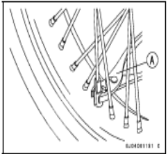 • Insert a new cotter pin [A]. ○When inserting the cotter pin, if the slots in the nut do not align with the cotter pin hole in the axel, tighten the nut clockwise [B] up to next alignment. ○It should be within 30 degree. ○Loosen once and tighten again when the slot goes past the nearest hole. Bend the cotter pin [A] over the nut [B]. • Check the rear brake effectiveness. • Check the rear brake light switch timing, and adjust it if necessary (see Brake Light Switch Operation Inspection in the Periodic Maintenance chapter). Wheel Inspection • Raise the front or rear wheel and turn it by hand to check Special Tool - Jack: 57001-1238 • If any abnormal condition is found, replace the hub bear Spoke Inspection • Refer to the Spoke Tightness and Rim Runout Inspection Rim Inspection • Refer to the Spoke Tightness and Rim Runout Inspection