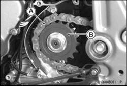 Drive Chain Slack Inspection • Refer to the Drive Chain Slack Inspection in the Periodic Wheel Alignment Inspection/Adjustment • Refer to the Drive Chain Slack Inspection in the Periodic Drive Chain Wear Inspection • Refer to the Drive Chain Wear Inspection in the Periodic Drive Chain Lubrication • Refer to the Drive Chain Lubrication in the Periodic Main Drive Chain Removal • Remove: Rear Wheel (see Rear Wheel Removal in the Wheels/Tires chapter) Swingarm (see Swingarm Removal in the Suspension chapter) Engine Sprocket Cover Drive Chain Guide • Disengage the drive chain [A] from the engine sprocket