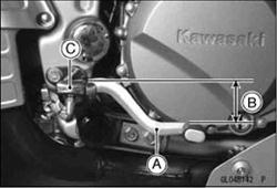 Brake Pedal Position Inspection • With the brake pedal [A] in the correct position, inspect Footpeg [C] Pedal Position • If it is incorrect, adjust the brake pedal position. Brake Pedal Position Adjustment О Usually it is not necessary to adjust the pedal position, but always adjust it when push rod locknut has been loosened.