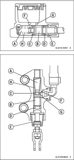 Master Cylinder Inspection (Visual Inspection) • Disassemble the master cylinder (see Front/Rear Master Cylinder Disassembly). • Check that there are no scratches, rust or pitting on the inner wall of the master cylinder [A] and on the outside of the piston [B]. • If the master cylinder or piston shows any damage, replace them. • Inspect the primary [C] and secondary [D] cups. • If a cup is worn, damaged, softened (rotted), or swollen, the piston assembly should be replaced to renew the cups. • If fluid leakage is noted at the brake lever, the piston assembly should be replaced to renew the cups. • Check the dust cover [E] for damage. Check that the relief [F] and supply [G] ports are not • plugged. • If the relief port becomes plugged, the brake pads will drag on the disc. Blow the ports clean with compressed air. • Check the piston return spring [H] for any damage. • If the spring is damaged, replace it.