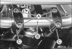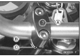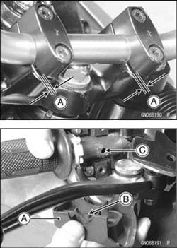 Front Brake Master Cylinder (see Front Brake Master Cylinder Removal in the Brakes chapter) • Unscrew the handlebar mounting bolts [A] and remove Handlebar Installation • Install the handlebar clamps so that the arrow [A] on the clamp points to the front. • Set the handlebar to match its punched mark [B] to the lower mating face [C] of the clamp rear part.