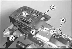• Remove the carrier mounting bolts [B], and remove the carrier [C] with the turn signals installed to the carrier stays [D].