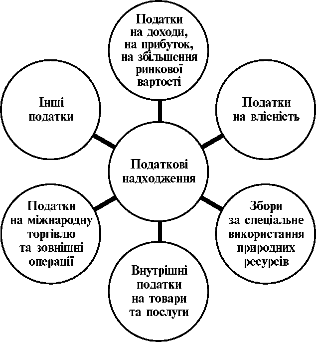 В цілому зазначена класифікація демонструє наявність в національній системі оподаткування досить широкого кола податків різної спрямованості. При цьому слід зазначити, що саме за допомогою системи оподаткування вирішуються питання формування не лише доходів бюджету, а й впливу держави на економіку, на всі сторони її суспільного життя, тобто на основні макроекономічні процеси та пропорції. Водночас вона відображає специфічні соціально-економічні умови розвитку даної країни, її зовнішню і внутрішню політику, географічне положення, кліматичні умови, традиції народу тощо. Разом із тим через податки відбувається тісний зв'язок між державою та юридичними і фізичними особами щодо формування, розподілу й використання їхніх доходів. Однак у світі ще не знайдено універсального підходу до побудови такої системи оподаткування, яка б повністю задовольняла потреби і держави, і платників податків. Україна пройшла досить тривалий і складний шлях, перш ніж податки увійшли в її економічне життя і стали стабільним джерелом формування доходів бюджету та вагомим фінансовим регулятором макроекономічних процесів. Проте дієвість регулятивної природи податків і їх ринкова саморегуляція на основі реалізації об'єктивних економічних законів у сучасних умовах соціально-економічного розвитку нашої держави не завжди приводить до бажаних результатів, що, у свою чергу, ускладнює позитивні зрушення у виробничій і соціальній сферах. Наразі в Україні залишається актуальним питання оптимізації регулятивного впливу системи оподаткування на соціально-економічний розвиток держави. Крім того, на кожному наступному етапі становлення і розвитку національної податкової системи виникають нові проблеми, що вимагають інших підходів до процесу формування механізму оподаткування, адекватного умовам економіки, що трансформується, творчого осмислення та впровадження таких податків, які більшою мірою реалізовували їх фіскальну та регулюючу функцію, відображали об'єктивний стан економіки України. Детальний розгляд структури доходів Зведеного бюджету України свідчить, що загалом у нашій державі створено сучасну податкову систему, яка наближається до індустріального європейського типу. Основна маса доходів мобілізувалася у формі прямих і непрямих податків, внесків у централізовані фонди, надходжень від зовнішньоекономічної діяльності та інших джерел. У бюджетній класифікації, як зазначалося, систематизація податкових платежів є дещо іншою. До першої групи податкових надходжень віднесені податки на доходи, податки на прибуток, податки на збільшення ринкової вартості: податок з доходів фізичних осіб та податок на прибуток підприємств. Фіскальне значення зазначених податків у формуванні доходів бюджету України є досить суттєвим. До другої групи податкових надходжень відносяться податки на власність (періодичні податки на чисту вартість майна (податок на нерухоме майно підприємств та податок на нерухоме майно громадян), а також податок з власників транспортних засобів та інших самохідних машин і механізмів). Третю групу податкових надходжень об'єднують збори за спеціальне використання природних ресурсів (збір за спеціальне використання лісових ресурсів та користування земельними ділянками лісового фонду, збір за спеціальне водокорист