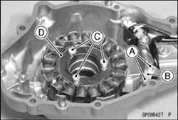 • Remove the screws [A] and the holding plate [B] for the stator wiring. • Unscrew the Allen bolts [C] and remove the stator [D]. Remove the grommet for the crankshaft sensor lead.