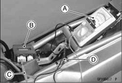 • Set the Hand Tester [A] to the × 25 V DC range, and Tester (+) terminal [B] —► BR/W lead Tester (-) terminal [C] —► BK/Y lead Special Tool - Hand Tester: 57001-1394 Needle Adapter Set: 57001-1457 • Turn the ignition switch on, and read the voltage. IC Igniter Operation Voltage: Battery Voltage • If the tester reading is not specified one, check the battery