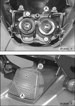 Headlight Unit/Housing Installation • Headlight unit/housing installation is the reverse of re City Light Bulb Replacement • Remove the headlight unit/housing (see Headlight Unit/Housing Removal). • Pull out the city light socket [A] with the bulb. Remove the bulb and replace it. Tail/Brake Light Bulb Replacement Remove the tail/brake light lens screws [A] and lens [B].