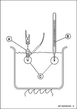 Water Temperature Switch Inspection • Remove the water temperature switch (see Water Temperature Switch Removal in the Cooling System chapter). • Suspend the switch [A] in a container of coolant so that the temperature sensing projection and threaded portion are submerged. • Suspend an accurate thermometer [B] in the coolant so that the sensitive portions [C] are located in almost the same depth. OThe switch and thermometer must not touch the container sides or bottom. • Place the container over a source of heat and gradually raise the temperature of the coolant while stirring the coolant gently. • Using the hand tester, measure the internal resistance of the switch across the terminal and the body at the temperatures shown in the table. • If the hand tester does not show the specified values, replace the switch. Water Temperature Switch Connections Rising temperature: From OFF to ON at 113 ~ 117°C (235 ~ 243°F) Falling temperature: From ON to OFF at 108°C (226°F) temperature less than ON temperature OFF: More than 1 МП