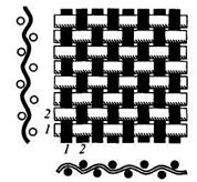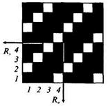 В тканях, не имеющих начеса, ткацкое переплетение является важнейшим фактором, определяющим блеск, рельефность (фактуру) лицевой стороны. Эстетические, механические, гигиенические и технологические свойства ткани в значительной степени зависят от вида ткацкого переплетения. Характер ткацкого переплетения, размеры и форма ткацких рисунков являются одним из главных признаков распознавания тканей. Простые переплетения. В простых переплетениях раппорт по основе всегда равен раппорту по утку. В пределах раппорта каждая основная нить переплетается с уточной только один раз. Полотняное переплетение – простейшее и наиболее распространенное, в котором основные и уточные нити чередуются через одну (рис. 2.4). Схема полотняного переплетения напоминает шахматную доску. Раппорт по основе и по утку Ro=Ry=2. В полотняном переплетении наиболее короткие перекрытия, поверхность ткани обычно ровная, одинаковая с двух сторон. Полотняным переплетением вырабатываются ткани различного волокнистого состава и назначения: ситец, бязь, миткаль, батист, маркизет, крепдешин, креп-шифон, креп-жоржет, креп-марокен, шерстяное сукно, льняные полотна и др.