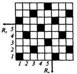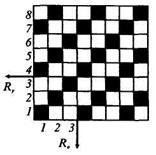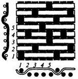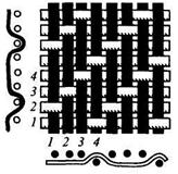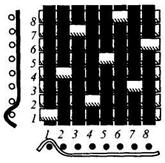Полотняное переплетение придает ткани наибольшую прочность и при большой плотности повышенную жесткость. В тканях полотняного переплетения, имеющих основу значительно тоньше, чем уток, возникает поперечный рубчик по типу репсового переплетения. Такие ткани (поплин, хлопчатобумажная тафта и др.) называются ложнорепсовыми. Саржевое переплетение образует характерный рубчик, идущий по диагонали ткани снизу вверх слева направо (рис. 2.5). Отличительные особенности саржевого переплетения: – число нитей в раппорте не меньше трех (Ro=Ry=3); – при каждой последующей прокидке уточной нити ткацкий рисунок сдвигается на одну нить. Раппорт саржевого переплетения обозначается дробью: числитель показывает число основных перекрытий в пределах раппорта, а знаменатель – число уточных перекрытий. Раппорт саржи равен сумме цифр числителя и знаменателя. Если на лицевой поверхности ткани саржевого переплетения преобладают основные нити, саржа называется основной (рис. 2.6), например, саржа 2/1, 3/1, 4/1 и др. Если на лицевой поверхности ткани преобладают уточные нити, то саржа называется уточной, например саржа 1/2, 1/3, 1/4. Рубчик в тканях саржевых переплетений на лицевой поверхности обычно идет слева направо, но в некоторых тканях может иметь противоположное направление (обратное саржевое переплетение). Угол наклона рубчика зависит от раппорта переплетения, толщины нитей, плотности основы и утка. В равноплотных саржевых тканях, имеющих основу и уток одинаковой толщины, рубчик обычно идет под углом 45°. Особенности сатинового (атласного) переплетения: при каждой следующей прокладке уточной нити ткацкий рисунок сдвигается не менее чем на две нити (а не на одну, как в полотняном или саржевом переплетении). Минимальное число нитей в раппорте 5 (Ro=Ry= 5). Сатиновые и атласные переплетения позволяют придать тканям гладкую, блестящую лицевую поверхность. Лицевой застил в тканях сатиновых переплетений образуется из уточных нитей, в тканях атласных переплетений – из основных нитей. Например, в пятиниточном сатиновом переплетении каждая уточная нить перекрывает четыре нити из пяти основных. При каждой последующей прокладке уточной нити производится сдвиг перекрытий на две (рис. 2.7) или на три нити. Атласное переплетение -негатив сатинового: каждая основная нить перекрывает четыре нити из пяти уточных (рис. 2.8). Наибольшее распространение имеют сатин и атлас с раппортами 5, 8, 10.