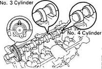 4 Roll the exhaust camshaft down into position. Turn the intake camshaft back-and-forth a little until the exhaust camshaft sits in the bearings evenly.
