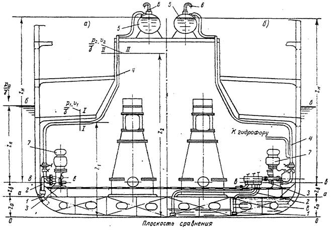 Насосная установка может быть предназначена для приёма жидкости из-за борта, удаления её за борт, перемещения в пределах корпуса судна по трубопроводам из цистерны в цистерну, подачи жидкости к механизмам, котлам и так далее. Работа насосной установки при размещении насоса ниже или выше уровня перекачиваемой жидкостью. Насос может быть расположен ниже уровня перекачиваемой жидкости или выше его. Рассмотрим уравнение жидкости перекачиваемой насосом и найдём уравнение напора всасывания насосной установки, расположенной ниже уровня перекачиваемой жидкости (рис. 3 а) Выбрав плоскость сравнения (о-о) и применяя уравнение Д.Бернулли для свободной поверхности моря {6-6) и сечения трубопровода на линии всасывания в насосе (в-в), можем записать: (Za +Zв +Zn) + Pб / γ + V б2 / 2g = (Z + Z) + Pв / γ + V в2 / 2g + hп (1)