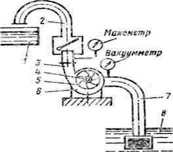 Принцип действия ЦН (Рис.5) состоит в следующем: при вращении РК 5 его лопасти 4, образующие межлопастные каналы, оказывают силовое воздействие на жидкость и преобразуют механическую энергию приводного двигателя в энергию перекачиваемой жидкости. Жидкость, поступающая из всасывающего трубопровода 7, приемного резервуара 8 в центр РК насоса 5, обтекает его лопасти и с их помощью отбрасывается к периферии, откуда выбрасывается в спиральный отвод 6 и направляется в диффузорный выходной патрубок 3, где происходит снижение ее скорости и преобразование кинетической энергии потока в потенциальную энергию давления. Затем через напорный трубопровод 2 она поступает в напорную емкость 1. У центра РК образуется область пониженного давления, за счет чего жидкость и поступает из всасывающего трубопровода через входной конфузорный патрубок насоса к РК. Учитывая, что РК насоса вращается при