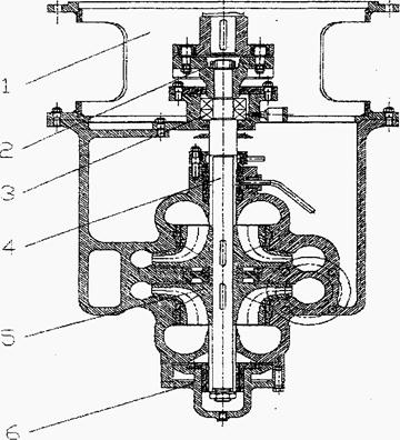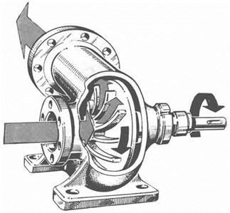 Рис. 6. Центробежный насос. Центробежные насосы являются самыми распространёнными из всех типов лопастных насосов. Это объясняется широким диапазоном их подач (до 70 м3с) и напоров (до нескольких сотен метров). Насос НЦВ 40 (рис. 7) является 2-х ступенчатым, однопотоковым с двумя рабочими колесами 5, расположенными на валу симметрично; такое расположение колес теоретически уравновешивает осевые гидравлические нагрузки, воспринимаемые валом 4, вследствие чего пятовый подшипник 3 воспринимает только собственный вес ротора и случайные осевые силы. Рабочие колёса насоса работают в двух опорах: ·
