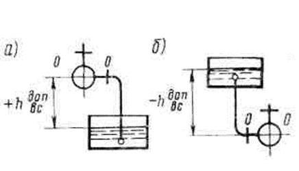 Рис. 12. К определению допустимой высоты всасывания В судовой практике в таких условиях работают конденсатные, бустерные, а в некоторых случаях и питательные насосы. Кроме того, Исходя из этого, возможны два различных случая установки насосов: при перекачивании жидкости с низкой температурой (рис. 12, а) и с высокой (рис. 12,6). Схема рис. 12,6 преимущественно используется в системах регенерации ПТУ и питания парогенераторов. Вакуумметрическая высота всасывания hвак — это величина вакуума у входного патрубка насоса. Она связана с