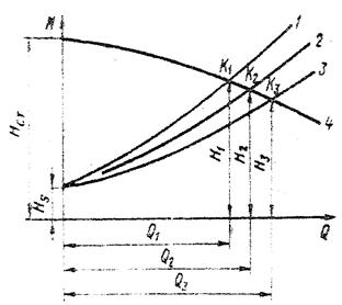 Точкой К, находящейся на пересечении характеристик насоса и трубопровода, обозначен рабочий режим, при котором расход жидкости по трубопроводу и подача насоса равны, когда весь напор, создаваемый насосом идёт на преодоление гидравлических сопротивлений трубопровода. Анализируя работу насосной установки: во всех режимах её работы, делаем следующие выводы: 1. Если показатели её работы (Q и Н) находятся слева от рабочей точки К, то создаваемый насосом напор больше напора необходимого для преодоления гидравлических сопротивлений трубопровода, поэтому жидкость на выходе из трубопровода имеет избыточное давление. 2. Если показатели её работы (Q и Н) находятся справа от рабочей точки К, то создаваемый насосом напор будет меньше возникающих гидравлических потерь в трубопроводе, т. е. данный насос не удовлетворяет работе на данный трубопровод.