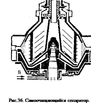 Тарелки барабана. Барабаны пурификаторов и кларификаторов содержат каждый по пакету конических дисков (тарелок). В каждом таком пакете может быть до 150 тарелок, отделенных одна от другой небольшим зазором (просветом). Процесс отделения примесей и воды из топлива происходит между этими тарелками. Ряды центрированных отверстий, расположенных в каждой тарелке около ее наружной кромки, служат для поступления в межтарельчатые пространства грязного топлива, т. е. топлива, подлежащего обработке. Под действием центробежной силы легкие компоненты (чистое топливо) перемещаются к оси вращения барабана, а вода и примеси (более тяжелые компоненты) отбрасываются к периферии барабана, т. е. к его стенкам. Вода и примеси образуют отстой (шлам), который движется к периферии барабана вдоль нижних сторон (поверхностей) тарелок. Периодическая работа сепаратора. Некоторые сепараторы сконструированы так, что имеют непродолжительный период работы. Затем их выключают для очистки отсепарированных примесей (плотных частиц). После очистки тарелок и удаления шлама из барабана сепаратор опять включают. При такой периодической работе используются барабаны двух различных конструкций: длинный узкий и короткий широкий барабаны. Для сепараторов с узким барабаном требуется очистка после непродолжительного периода работы. Для этого барабан необходимо разбирать. Очистка такого узкого барабана, не имеющего пакета тарелок, намного проще, чем барабана с тарелками. Сепаратор с широким барабаном и с тарелками можно чистить на месте, хотя и имеются дополнительные трудности в очистке пакета конических тарелок. Непрерывная работа сепаратора. Сепараторы с широкими барабанами современных конструкций могут эффективно работать в течение длительного периода. Это достигается путем выброса (выстреливания) через определенные промежутки времени шлама из барабана. Шлам скапливается по периферии барабана в процессе непрерывкой его сепарации из топлива. Через определенные промежутки времени шлам выбрасывается из барабана наружу, прежде чем он начнет отрицательно влиять на процесс сепарации топлива. В начале процесса выброса шлама (автоматическая очистка барабана) подачу топлива в сепаратор прекращают и топливо, оставшееся в барабане, удаляют впуском промывочной воды. Вода заполняет гидравлическую систему, расположенную в нижней части барабана, и открывает пружинные клапаны. Затем под воздействием воды движется вниз подвижная нижняя часть барабана. В результате этого открываются выпускные окна, расположенные по периферии барабана в его средней части. Шлам выталкивается через эти окна центробежной силой. Затем под воздействием воды поднимается подвижная часть барабана опять вверх (в исходное положение). В результате этого выпускные окна закрываются. Затем в барабан подается вода для восстановления жидкостного уплотнения (водяного затвора), необходимого для процесса сепарации. После этого возобновляют подачу в сепаратор необработанного топлива и процесс сепарации продолжается. Выброс шлама длится всего несколько секунд и сепаратор при этом работает непрерывно. В существующих конструкциях сепараторов применяются разные способы удаления шлама из барабана, например полное удаление, частичное управляемое удаление и т. д. При частичном управляемом удале