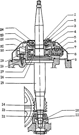 Рис. 37. Конструкция вертикального вала сепаратора серии МАРХ207S-00. Позиции соответствуют следующим деталям: 1 -резиновое кольцо (уплотнительное) для верхнего маслоотбрасывателя; 2 -болт верхней крышки; 3 -крышка подшипника; 4 -болт; 5 -амортизатор; 6 -пружина; 7 -гайка пружины; 8 -крышка верхнего подшипника; 9 -резиновое кольцо крышки; 10 -шайба; 11 -кольцевая гайка со стопорной шайбой; 12 -нижний шарикоподшипник; 13 -кольцевая гайка, червяка; 14 -червяк; 15 -вал барабана; 16 -шайба; 17 -осевой амортизатор; 18 -резиновое кольцо; 19 -болт; 20 -корпус подшипника; 21 -верхний шарикоподшипник; 22 -маслоотбрасыватель; 23 -корпус пружин; 24 -верхний маслоотбрасыватель, Данный вал отличается от других валов. Отсутствует средняя опора и упрощена конструкция нижней опоры, вместо упорного подшипника установлен сферический подшипник 12, который воспринимает радиальные и осевые нагрузки. Схема детальной компоновки в данном случае не приводится. Она, как правило, даётся в фирменной инструкции по эксплуатации сепаратора. Одним из важных узлов сепаратора, от которого в большой степени зависит надёжность его работы, является привод. Наибольший интерес представляет конструкция вертикального вала. Имеется ряд отличий в исполнении валов различными фирмами. Функция вертикального вала заключается в передаче крутящего момента барабану сепаратора с помощью червячно - винтового механизма от горизонтального вала, соединенного с электродвигателем. Барабан, как правило, имеет относительно большую массу Она всегда имеет остаточный дисбаланс и, следовательно, конструкция опор вертикального вала должна учитывать это обстоятельство. Рассмотрим конструкцию и компоновку деталей вертикального вала сепаратора серии МАРХ309В-00, которые представлены далее.