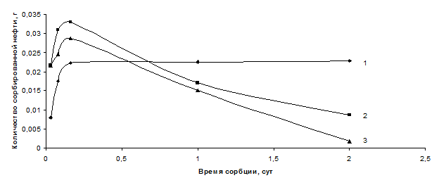 Зависимость сорбционной способности сорбентов от времени сорбции: 1 – модифицированный ДССК, 2- модифицированный СКН-26, 3- модифицированный СКС Как видно из представленных данных, максимальная сорбция нефти осуществляется в первые ее часы (~ 4 часа), после чего сорбент на основе ДССК в течение двух суток способен удерживать сорбированную нефть, тогда как сорбенты на основе СКН-26 и СКС спустя 4 часа активной сорбции начинают постепенно выпускать ее. Подобное поведение сорбентов может быть связано как с меньшим уровнем гидрофобности и олеофильности сорбентов на основе СКН-26 и СКС, так и разным строением полученных сорбентов.