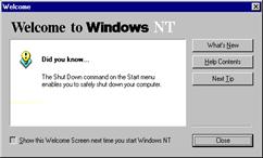 3. On the Welcome to Windows NT screen, choose one of the following four options: What's New? toget answers to common questions asked by users who have used Windows NT before. Help Contents tosearch for Help by typing a subject, title, or specific word or phrase. Next Tip toview another tip on the Welcome screen. Close button to close the Welcome screen and begin working with Windows NT.