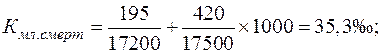 Так, в городе N за текущий год родилось 17 500 человек, за предыдущий – 17 200 человек. Всего умерло в возрасте до одного года в текущем году 615 детей, из них умерло в текущем году 420 человек, в предыдущем 195 человек. Рассчитаем коэффициент младенческой смертности двумя способами: