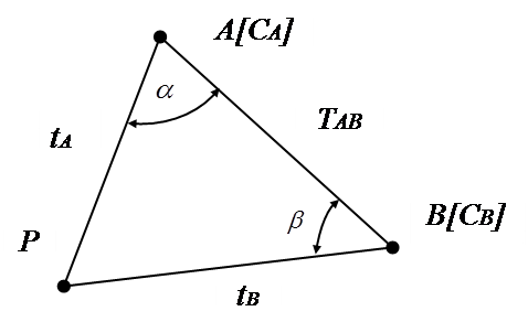 Предположим, что в некотором регионе в населенных пунктах А и В расположены предприятия-конкуренты, выпускающие однотипную продукцию или оказывающие один и тот же вид услуг. Цена за единицу продукции предприятия А составляет CА р., цена за единицу продукции предприятия В, - соответственно, СВ р. Расстояние между предприятиями-конкурентами ТАВ, расстояние от потребителя Р до предприятия А – tA, до предприятия В – tB. В условиях выбора пункта приобретения продукта покупатель имеет два варианта совершения покупки. Для каждого из этих вариантов затраты с учетом транспортных расходов могут быть представлены следующим образом: