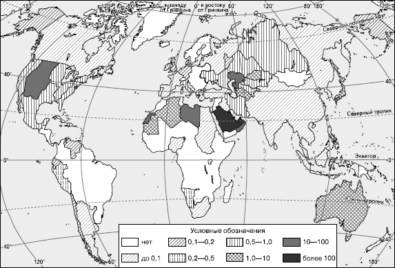 Рис. 21. Потребление опресненной воды, м3 в год на одного человека (по А.Б.Авакяну) В середине 1990-х гг. опреснительные установки работали уже более чем в 100 странах мира. Одни из этих стран расположены в пределах умеренного пояса (например, Великобритания, Нидерланды, США), другие – в субтропическом поясе (например, Италия, Греция, Япония, Азербайджан, Туркмения). Но больше всего таких стран находится в пределах тропического пояса с его обширной аридной зоной. В Северной Африке это Тунис, Ливия, Египет, в Юго-Западной Азии – Саудовская Аравия, Кувейт, ОАЭ, Катар, Ирак, Иран, Израиль, в Америке – США (южные районы), Мексика, Куба, Венесуэла. Больше всего опресненной воды из расчета на одного жителя получают в странах Персидского залива (рис. 21), где такая вода служит главным источником водопотребления (в Кувейте, например, на 100 %). Здесь же находятся опреснительные установки, относящиеся к наиболее мощным в мире. Из отдельных районов по тем же показателям выделяется Калифорния (США, Мексика). Особо следует сказать об островных микрогосударствах, зависимость которых от потребления опресненной морской воды также очень велика. Это в полной мере относится не только к Багамским, Бермудским, Виргинским, нидерландским Антильским островам в Карибском море и Атлантике, но также к Канарским островам и островам Зеленого Мыса у западного побережья Африки, к ряду островов Французской Полинезии. В Советском Союзе самые крупные опреснительные установки находились на восточном побережье Каспийского моря (п-ов Мангышлак). Ныне одна из этих установок, находящаяся в Туркмении, ежесуточно опресняет 120 тыс. м3 морской воды. При прогнозировании развития индустрии опреснения нужно иметь в виду возможные экологические последствия ее деятельности, поскольку отходы опреснения, которые складируют на суше или сбрасывают в море в виде рассолов, негативно воздействуют на экосистему. То же относится и к отработанным водам АЭС, которые работают «в паре» с опреснительными установками.