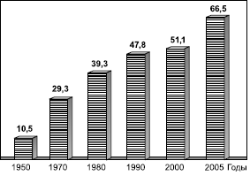 Автомобилестроение, зародившееся в конце XIX в., принято относить к новым отраслям промышленности. Но среди этой группы отраслей оно продолжает играть совершенно особую роль. По масштабам влияния на мировое хозяйство в течение всего XX в. автомобилестроение, может быть, уступает только нефтяной промышленности. Вот почему по отношению к нему нередко употребляют определение типа «становой хребет», «локомотив», «барометр экономики». Автомобильная промышленность – главная составная часть транспортного машиностроения. Более того, во многих развитых странах она обеспечивает от 5 до 10 % всего производства ВНП. Но значение ее выходит далеко за рамки транспортной подотрасли. Это объясняется, во-первых, тем, что автомобильная промышленность выступает в роли основного потребителя многочисленных видов продукции других отраслей (стали, алюминия, пластмасс, свинца, каучука, электронных изделий и т. д.). Во-вторых, тем, что с ней непосредственно связан автомобильный бизнес в широком смысле этого слова, включающий в себя сбыт и обслуживание автомобилей, строительство и ремонт автодорог и др. В-третьих, тем, что на протяжении большей части XX в. именно автомобильная промышленность находилась в авангарде научно-технического прогресса, а также прогресса в области организации труда и менеджмента. Так, именно она положила начало и фордизму, и постфордизму, ознаменовавшему новый технический переворот в развитии производства. Неудивительно, что на протяжении всего XX в. мировое производство автомобилей постоянно возрастало. Перед Второй мировой войной в мире выпускалось примерно 4 млн автомобилей в год, в 1950 г. их производство превысило 10 млн, в начале 1960-х гг. выпускали уже 20 млн, в 1970 г. – 30 млн, в 1980 г. – 40 млн, в 2000 г. свыше 50 млн (рис. 82), а в 2005 г. – 66,5 млн. Из этого количества почти 4/5 приходится на легковые автомобили, а остальное – на грузовые и автобусы.