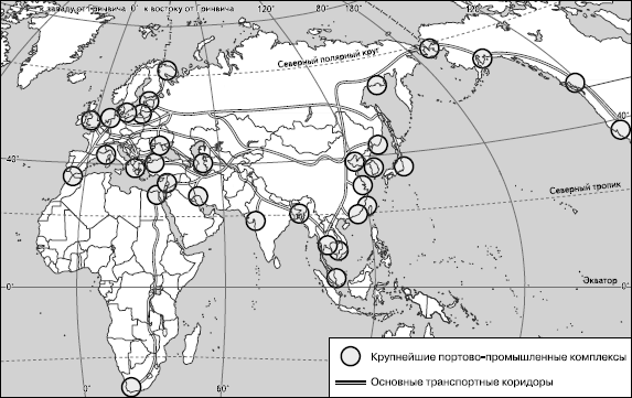 Рис. 168. Евразийские транспортные коридоры XXI в. (по В. А. Дергачеву) Несколько очень крупных новых проектов, которые также можно отнести к категории глобальных, связаны с международными транспортными коридорами (МТК). По определению В. А. Дергачева, так следует называть коридоры, концентрирующие на главных направлениях как транспорт общего пользования (железнодорожный, автомобильный, морской, речной, трубопроводный), так и телекоммуникации. На пересечении таких МТК, представляющих собой полимагистрали, обычно формируются транспортные узлы, которые в условиях льготного режима должны обеспечивать разнообразие предоставляемых услуг и их высокое качество. Они должны также способствовать дальнейшему развитию торгового и культурного обмена между странами. Основные транспортные коридоры в наши дни проектируют на самом большом материке – Евразии (рис. 168). Два из них – один широтный и один меридиональный – имеют наибольшее значение и вызывают особый интерес. Во-первых, это проект ТРАСЕКА («Транспортная система Европа – Кавказ – Азия»), который часто именуют также новым Великим шелковым путем.[110] Когда в 1993 г. в Брюсселе по инициативе Европейского союза было объявлено об учреждении программы ТРАСЕКА с участием восьми государств Кавказа и Средней Азии, многие рассматривали этот акт скорее как политический. Но в 1998 г. на международной конференции в Баку он принял гораздо более реалистические очертания. В Баку было подписано соглашение о международном транспортном коридоре Европа – Азия, который в будущем может оказать немалое воздействие на международные грузовые и пассажирские перевозки всеми видами транспорта. Основная магистраль ТРАСЕКА пройдет от Стамбула до Пекина с ответвлениями на Афганистан и Индию. Создание ее уже фактически началось: построен важный соединительный железнодорожный путь от Мары (Туркмения) до Мешхеда (Иран). Китай закончил реконструкцию магистрали от Желтого моря до границы с Казахстаном. Многие специалисты относятся к этому проекту скептически. Надо учитывать и то, что ТРАСЕКА запланирована в обход России. Во-вторых, это проект ТКЖМ (Трансконтинентальной железнодорожной магистрали), которая в перспективе должна связать железнодорожные системы России, США, Канады, а также некоторых стран Восточной Азии. Для начала реализации этого проекта еще в 1991 г. был учрежден международный консорциум «Трансконтиненталь», в котором в качестве страны-учредителя участвует и Россия. Согласно расчетам специалистов, для осуществления этого проекта России нужно будет достроить 6000 км двухпутной и полностью электрифицированной железной дороги. Новая магистраль пройдет от станции Тында (БАМ) до Якутска, затем от Якутска до Магадана, далее до поселка Уэлен на Чукотке. Связь с Северной Америкой должна осуществляться по туннелю под Беринговым проливом. Согласно проекту, он (как и Евротуннель) будет состоять из двух основных железнодорожных туннелей диаметром по 9 м и расположенного между ними сервисного туннеля меньшего диаметра. Длина проектируемого туннеля, включая подземную часть и подъездные пути к нему с обеих сторон, составит 92 км. Туннель свяжет магистраль с железнодорожной сетью Аляски, Канады и основной территории США, сделав ее трансконтинентальной. С юга к ней присоединятся железные дороги других стран