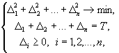 . . Следовательно, суммарные потери за рассматриваемый интервал времени момента [ tk; tk+ 1) равны Выбирая δ оптимальным образом, минимизируем суммарные затраты и потери за рассматриваемый интервал времени. Продифференцировав функцию f (δ) по δ и приравняв производную 0, получим оптимальное значение δ, а именно: При оптимальном δ затраты за период с tk до tk+ 1, как нетрудно подсчитать, равны На втором этапе оптимизации зафиксируем число скачков и найдем при этом условии оптимальные моменты скачков t 1, t 2, t 3, … Положим Δ j = tj+ 1 - tj, где j = 1, 2, …, n, причем примем tn+ 1 = T, где T – горизонт планирования. Тогда суммарные затраты за весь рассматриваемый интервал планирования равны Эту функцию необходимо минимизировать по всем n неотрицательным переменным Δ j, j = 1, 2, …, n, при условии Δ1 + Δ2 + … + Δ n = T. Достаточно решить чисто математическую задачу оптимизации