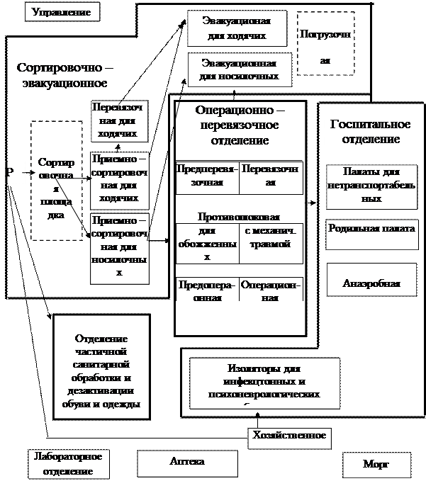 В то же время в составе каждого этапа медицинской эвакуации обычно развертывается ряд типовых функциональных подразделений, выполняющих соответствующие задачи. Для приема и сортировки поступающих раненых и больных предназначаются сортировочно-эвакуационное или приемно-сортировочное отделение. Если в соответствии с установленным объемом медицинской помощи часть раненых и больных будет эвакуирована далее в тыл непосредственно после сортировки, без направления их в другие функциональные подразделения ЛПУ, они размещаются и готовятся к эвакуации в эвакуационных палатках сортировочно-эвакуационного отделения. Из лечебных учреждений эвакуация раненых и больных ведется, как правило, непосредственно из лечебных отделений. Частичная или полная санитарная обработка раненых и больных, а также специальная обработка санитарного транспорта и носилок производится в отделении (на площадке) специальной обработки. Оказание медицинской помощи раненым и больным в объеме, свойственном данному этапу медицинской эвакуации, осуществляется в перевязочной, операционно - перевязочном и госпитальном отделениях. Для госпитализации и лечения раненых и больных предназначено госпитальное отделение. Для изоляции инфекционных больных развертывается изолятор. В составе этапов медицинской эвакуации предусматриваются подразделения, осуществляющие руководство их работой и материально-техническое обеспечение — управление (штаб), аптека, лаборатория, кухня, склады и т.д. Требования предъявляемые к месту развертывания этапа: Места (районы) для развертывания медицинских пунктов и лечебных учреждений выбираются с учетом конкретных условий (организации тыла, начертания дорог, радиационной и химической обстановки, наличия источников доброкачественной воды, санитарно-эпидемического состояния района, возможности использования местных средств для защиты и маскировки). Однако во всех случаях следует стремиться развертывать медицинские пункты и лечебные учреждения вблизи от путей подвоза и эвакуации, по возможности в стороне от объектов, которые могут привлечь внимание противника, в районах, где обеспечивается удобное размещение функциональных подразделений, хорошая их защита и маскировка, а также возможность организации надежной охраны и обороны. В то же время место развертывания должно быть максимально приближено к районам наибольших потерь в целях обеспечения оказания медицинской помощи раненым и больным в возможно короткие сроки (первой врачебной помощи — в первые 4-5 часов, квалифицированной — 8-12 часов с момента ранения, а при поражении ФОВ — первой врачебной помощи — в течение 2-4 часов, квалифицированной терапевтической помощи — 6-8 часов с момента появления признаков интоксикации). Этапы медицинской эвакуации должны быть постоянно готовы к работе в различных, нередко неблагоприятных условиях, к быстрой перемене места расположения и к одновременному приему большого числа раненых и больных, в том числе и непосредственно из очагов массового поражения.
