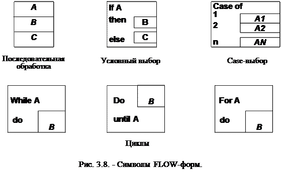 Дальнейшее развитие FLOW-формы получили в диаграммах Насси-Шнейдермана. На этих диаграммах символы последовательной обработки и цикла изображаются так же, как и соответствующие символы FLOW-форм. В символах условного выбора и case-выбора собственно условие располагается в верхнем треугольнике, выбираемые варианты – на нижних сторонах треугольника, а блоки обработки – под выбираемыми вариантами. Диаграмма Насси-Шнейдермана для вышеприведенного примера изображена на рисунке 3.10 [20].