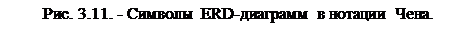 Нотация Чена Нотация ERD-диаграмм была предложена Ченом. Нотация Чена предоставляет богатый набор средств моделирования данных, включая собственно ERD-диаграммы, а также диаграммы атрибутов и диаграммы категоризации. Эти диаграммные техники используются для моделирования и проектирования как реляционных, так и иерархических и сетевых баз данных. Сущность представляет собой множество экземпляров реальных или абстрактных объектов (людей, событий, предметов, состояний, идей и т.п.), обладающих общими характеристиками (атрибутами). Любой объект системы может быть представлен только одной сущностью, которая должна быть уникально идентифицирована. При этом имя сущности должно отражать тип или класс объекта, а не его конкретный экземпляр (например, Город, а не Москва). Отношение представляет собой связь между двумя и более сущностями. Именование отношения осуществляется с помощью грамматического оборота глагола (Имеет, Определяет, Можетвладеть и т.п.). Другими словами, сущности представляют собой базовые типы информации, хранимой в базе данных, а отношения показывают, как эти типы данных взаимоувязаны друг с другом. Введение подобных отношений преследует две основополагающие цели: - обеспечение хранения информации в единственном месте (даже если она используется в различных комбинациях); - использование этой информации различными приложениями. Символы ERD-диаграмм, соответствующие сущностям и отношениям, приведены на рис. 3.11.