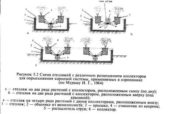 ИОНИТОПОНИКА ХЕМОПОНИКА Этот метод близок к культуре растений на почвосмесях. В качестве субстрата используют следующие виды органических материалов: верховой торф со степенью разложения 30%, сфагновый мох, древесную кору, опилки, рисовую шелуху, отходы хлопчатника и др. Срок использования этих материалов в качестве субстрата 1—2 года. Некоторые из органических материалов требуют предварительной подготовки — измельчения (кора, стружка) и корректировки реакции среды. Минеральное питание осуществляют поверхностным поливом питательным раствором. Хемопоника не требует специального оборудования, ее можно применять во всех видах защищенного грунта. В последние годы все большее распространение получает культура на кокосовом субстрате с длительным сроком его использования. Ионитопоника — совершенно новый метод, по своему существу близок к агрегатопонике. Субстрат состоит из смеси двух типов синтетических ионообменных смол: катионита КУ-2 и анионита ЭДЭ-10П. Катионит — это не растворимый в воде светло-желтого цвета полимер, имеющий сильнокислую реакцию, хорошую сыпучесть. Размер его гранул 0,3-0,5 мм. Гидроксилы он меняет на ионы минеральных солей (К+, Са++, М++ и др.). Анионит ЭДЭ-10П свои ионы меняет на S04,--, N03,-, Н2РО4— и др. Это желтый сыпучий полимер.размер его гранул 0,30-1,5 мм. Оба ионита прочные, химически стойкие, не разлагаются при воздействии кислорода, света и при обычной температуре. В отличие от агрегатопоники, питательные вещества находятся в составе субстрата, поэтому поливают только чистой водой. По существу это искусственная почва. Этот метод возделывания растений является более удачной модификацией беспочвенной культуры, чем метод водной культуры. Сущность его заключается в том, что корневая система растений развивается в условиях воздушной среды в полом пространстве, где через каждые 12—15 мин. в течение 5—7 сек. ее опрыскивают питательным раствором из форсунок (рис. 5.2)