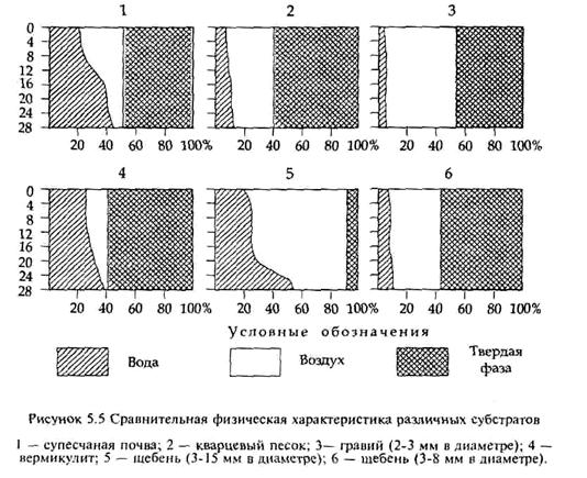 Соотношение твердой, жидкой и газообразной фаз показано на рис. 5.5. Субстрат для выращивания овощных растений не должен влиять на состав питательного раствора. Поэтому заранее определяют его кислотность, химический состав и инертность. Для этого его заливают питательным раствором, в котором предварительно определяют концентрацию элементов питания и кислотность. Через 8—10 часов раствор фильтруют и снова проводят анализ. Если химический состав раствора не изменился, субстрат используют для выращивания растений. Если же субстрат не является достаточно химически инертным, то перед посадкой в него растений требуется предварительная подготовка. Для предупреждения связывания фосфора полуторными оксидами и кальцием, свежий субстрат перед посадкой растений зафосфачивают, т.е. дают избыток фосфора с тем, чтобы связать все имеющиеся ионы алюминия, железа и кальция виде фосфорнокислых солей. Субстрат заливают 2%-ным раствором вытяжки из суперфосфата и выдерживают в течение суток, после чего промывают водой. Для этих целей можно использовать вместо вытяжки из суперфосфата ортофосфорную кислоту. Карбонаты кальция, содержащиеся в субстрате, при взаимодействии с ортофосфорной кислотой образуют на поверхности мало растворимую в воде пленку фосфата кальция. Химическая инертность субстрата значительно увеличивается.