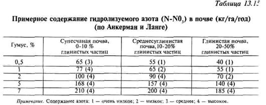 Таким образом, получив данные агрохимического анализа и зная метод определения, можно установить для определенной группы культур степень обеспеченности почвы анализируемым элементом. Можно привести примерные количества гидролизуемого азота — N— N03 накапливающегося в почве в течение вегетационного периода, в зависимости от количества гумуса, процента глинистых частиц в почве, что необходимо учитывать при планировании норм внесения удобрений, в частности, азотных. На легких почвах до 40% гицролизуемого азота усваивается растениями в течение вегетации, а остальное количество вымывается, особенно при обильных осадках или крупнообъемной ирригации (ДЦУ, Фрегат и т. п.). На суглинистых и глинистых почвах усвояемость растениями такого азота достигает 50%. В целом коэффициент использования подвижного азота из гумуса варьирует от 30 до 70%. Это следует учитывать при планировании системы удобрений.