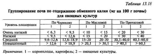 Калий. В почве калий находится в трех формах: * водорастворимой, легкодоступной; * обменной — адсорбированной поглощающим комплексом, доступной растениям; * необменной, входящей в состав почвообразующих минералов — дальнейший резерв питания растений. Растения используют первые две формы калия. Как видно из данных табл. 12.19, подвижный легкорастворимый калий находится в небольшом количестве. Для оценки уровня плодородия почвы по Чирикову необходимо учитывать количество обменного калия. В связи с тем что по различным методикам, использующим разные растворители для получения вытяжки из почвы, вынос элементов питания в вытяжку отличается количественно, за единицу расчета принято принимать: гидролизуемый азот — по Тюрину, подвижный фосфор — по Чирикову, подвижный калий — по Чирикову. Полученную информацию по уровню элементов питания умножают на коэффициент пересчета. Нормативы расчета на стандартный метод по Чирикову приняты следующие (см. табл. 12.20),