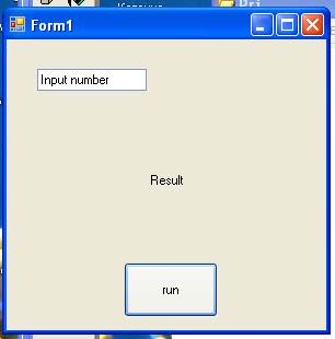} #pragma endregion private: System::Void button1_Click(System::Object^ sender, System::EventArgs^ e) { String ^str=textBox1->Text; x=Convert::ToDouble(str); label2->Text=Convert::ToString(f(x)); } private: System::Void Form1_Load(System::Object^ sender, System::EventArgs^ e) { textBox1->Text="Input number"; label2->Text=""; } }; }