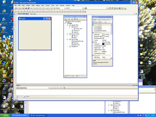 Далее идут строки подключения библиотек классов, необходимых для работы программы. using namespace System; using namespace System::ComponentModel; using namespace System::Collections; using namespace System::Windows::Forms; using namespace System::Data; using namespace System::Drawing; Далее идут строки объявления класса Form1 – наследника класса Form. public ref class Form1: public System::Windows::Forms::Form { public: Form1(void)// конструктор { InitializeComponent(); // //TODO: Add the constructor code here // } protected: /// <summary> /// Clean up any resources being used. /// </summary> ~Form1()//деструктор { if (components) { delete components; } } Автоматически сгенерированы: конструктор класса и деструктор. В разделе InitializeComponent находятся сгенерированные студией строки описания компонентов, включенных Вами в форму. После #pragma endregion идут обработчики событий, сгенерированные в результате Ваших действий: Вы два раза кликнули правую кнопку мыши на поле Button – был сгенерирован обработчик события нажатия кнопки – private: System::Void button1_Click(System::Object^ sender, System::EventArgs^ e){ } В обработчике button1_Click вызывается функция f(), описанная и объявленная в других файлах мультипрограммного проекта – в файле func.h и func.cpp. Для установки некоторых начальных значений создайте самостоятельно обработчик Form1_Load. Для этого надо «кликнуть» по полю формы. Начальные значения установите слудующим образом: · textBox1->Text="Введите число"; при запуске программы в окне Text Box появится соответствующее сообщение. · label2->Text=""; поле Label2 будет очищено.