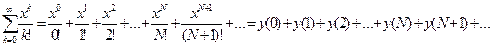 Значок «!» означает факториал. Простой пример: 5! = 1*2*3*4*5, 12! = 1*2*3*4*5*6*7*8*9*10*11*12, при этом 0! и 1! равны 1. Обратите внимание на тот факт, что при вычислении отдельно числителя и знаменателя достаточно быстро происходит переполнение типа данных. Например, 12!=479 001 600, что превышает ограничения сразу нескольких типов данных, таких как int и прочие. Кроме того, при делении одного очень большого числа на другое у нас получается большая погрешность вычисления, которая не всегда компенсируется большой разрядностью используемого типа данных. Для того чтобы избежать этих проблем, необходимо использовать специальную методику. Попробуем показать эту методику на примере нахождения значения ряда 1. Выстраиваем ряд в следующем представлении: 2. Определяем формулу перехода для (N+1)-ого члена ряда в формате: Дальнейшая работа по вычислению ряда будет выглядеть следующим образом: вычисляем первый член ряда исходя из известных данных. В нашем случае