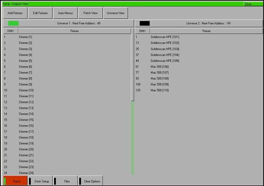 В режиме установки консоль обеспечивает функции для установки настроек консоли – назначение, поканальную привязку и редактирование интеллектуальных приборов, запись и загрузку шоу, очистку данных шоу, сброс консоли и т.д. Нажмите кнопку SETUP для отображения установочных параметров на МФК и в окне Setup Window на мониторе. Отобразятся следующие параметры: · Patch (привязка к каналам) · Desk Setup (наустройки консоли) · Files (файлы) · Clear Options (очистка параметров) · Network (сеть)