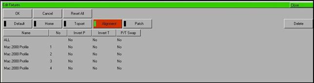 Редактирование значений по-умолчанию, «домашних» значений, максимальных значений Выбор редактируемых приборов До выполнения каких-либо операций по редактированию приборов выберите приборы, которые будут редактироваться, используя кнопки выбора приборов (МФК). Как только каждый прибор выбран, он добавляется в окно Edit Fixtures на мониторе. Приборы могут быть удалены из этой выборки в любое время нажатием их кнопки выбора (МФК). Нажмите на мониторе кнопку [Default] или [Home] или [Topset], в зависимости от потребностей (если еще не выбрано). Используйте кнопки управления курсором для перемещения курсора в отдельное поле для редактирования или используйте строку ALL для редактирования значения для всех выбранных приборов. Выберите требуемое поле, нажмите ENTER, введите требуемое значение и нажмите ENTER. После того, как сделаны все изменения, нажмите кнопку [OK] для возврата в окно Patch. Если Вы совершили ошибку при редактировании приборов или просто желаете вернуться к начальным значениям из библиотеки приборов, нажмите кнопку [Reset All]. Если Вы желаете отменить редактирование приборов, нажмите кнопку [Cancel]. Нажмите кнопку [Alignment] на мониторе. Используйте кнопки управления курсором для перемещения курсора в отдельные поля для корректировки и используйте строку ALL для корректировки всех выбранных приборов.