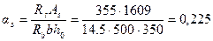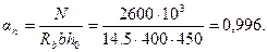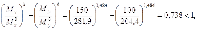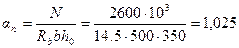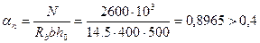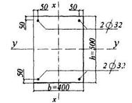 Требуется проверить прочность сечения. Расчет. Поскольку арматура задана в виде 4-х угловых стержней, прочность сечения проверяем согласно п.3.66. Оси симметрии, параллельные размерам h и b, обозначим х и у. Определим предельные моменты М ° x и М ° у. При действии момента в плоскости оси х принимаем b = 400 мм, h o= 500 - 50 = 450 мм. As = A's = 1609 мм2 (2Æ32). Поскольку а = 50мм < 0,15 h = 0,15·450 = 67,5 мм, расчет можем производить с помощью графика на черт.3.28. Для этого определяем На графике этим значениям соответствует ат = 0,24. Следовательно, М ° x =amRbbho 2= 0,24·14,5·400·4502 = 281,9·106 Нмм = 281,9 кНм. При действии момента в плоскости оси у принимаем b = 500 мм, ho = 400 - 50 = 350 мм. Поскольку а = 50 мм < 0,15 ho = 0,15 - 350 = 52,5 мм, момент М ° у также можно определить с помощью графика на черт.3.28. Значениям М ° у = amRbbho 2 = 0,23·14,5·500·3502 = 204,3·106 Нмм = 204,3 кНм. Определим показатель степени k. Поскольку Проверяем условие (3.129): т.е. прочность сечения обеспечена.